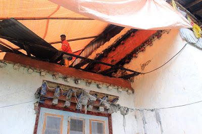 Pendant ce temps là à l'étage, Prakash et son équipe démonte la vieille toiture en tôle du toit de la cuisine sud afin de construire l'échafaudage en appui sur le sol.